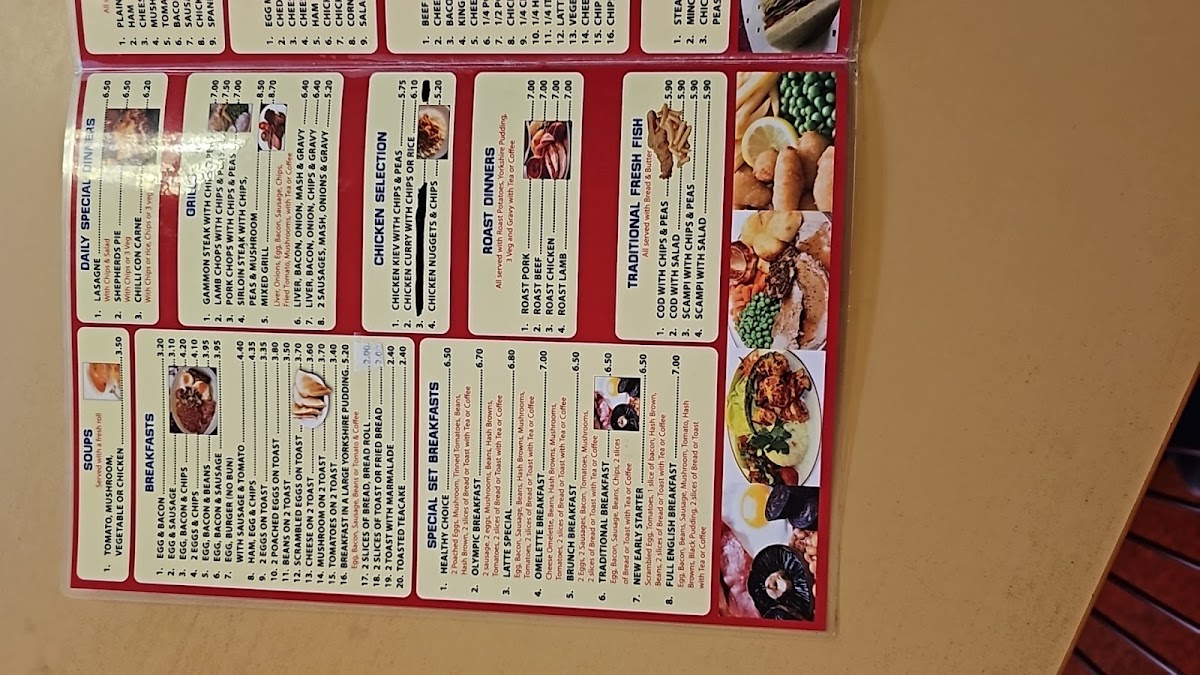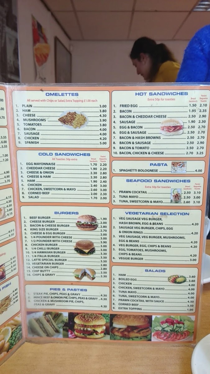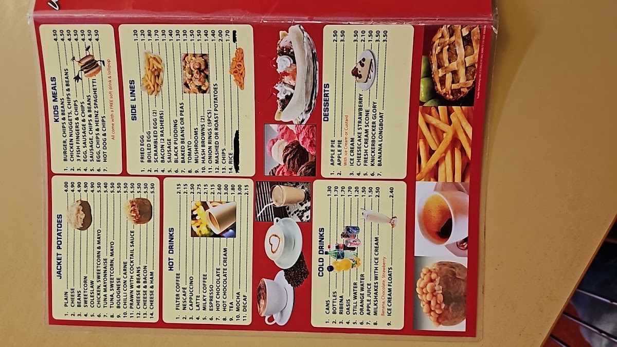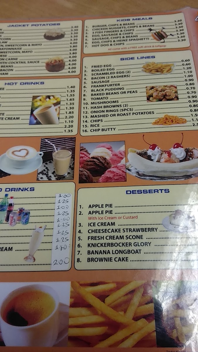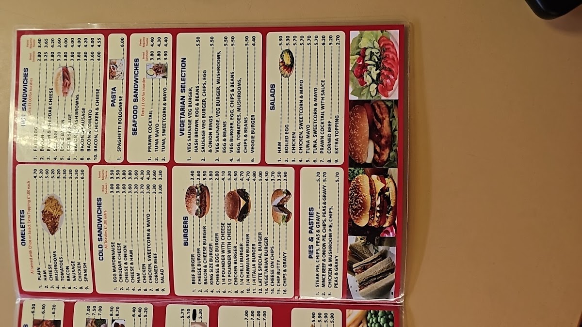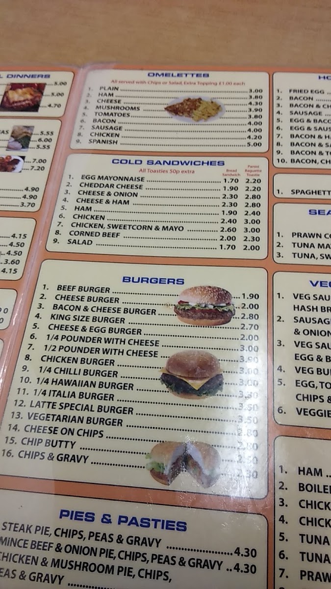 The menu at Café Latte in Gainsborough offers a diverse range of comforting dishes that cater to a variety of tastes. For breakfast or brunch, you can enjoy a hearty Bacon Sausage Omelette or a lighter Vegetarian Selection with options like Plain, Mushrooms, or Cheese. The selection of Salads includes hearty choices such as Chicken and Tuna Mayo, each served with a variety of toppings. For a quick bite, their Cold Sandwiches range from a classic Egg Mayonnaise to a flavorful Cheese & Onion sandwich. If you're craving something more filling, the Burgers come in all varieties, including the indulgent Bacon & Cheese Burger or the classic Beef Burger. Pies & Pasties such as the Steak Pie with Chips, Peas & Gravy offer a comforting, hearty meal. Complementing these meals are Side Lines like Bacon, Sausage, or a simple Fried Egg to add a little extra. Desserts like Apple Pie, Cheesecake, and the refreshing Knickerbocker Glory provide the perfect sweet ending. Additionally, the café offers a variety of hot and cold drinks, from Filter Coffee and Latte to Milkshakes with Ice Cream. The menu also includes Jacket Potatoes, Kids Meals, and even a selection of Others like Egg & Saus. Whether you're after a quick snack or a more substantial meal, Café Latte’s menu offers something for everyone at reasonable prices.